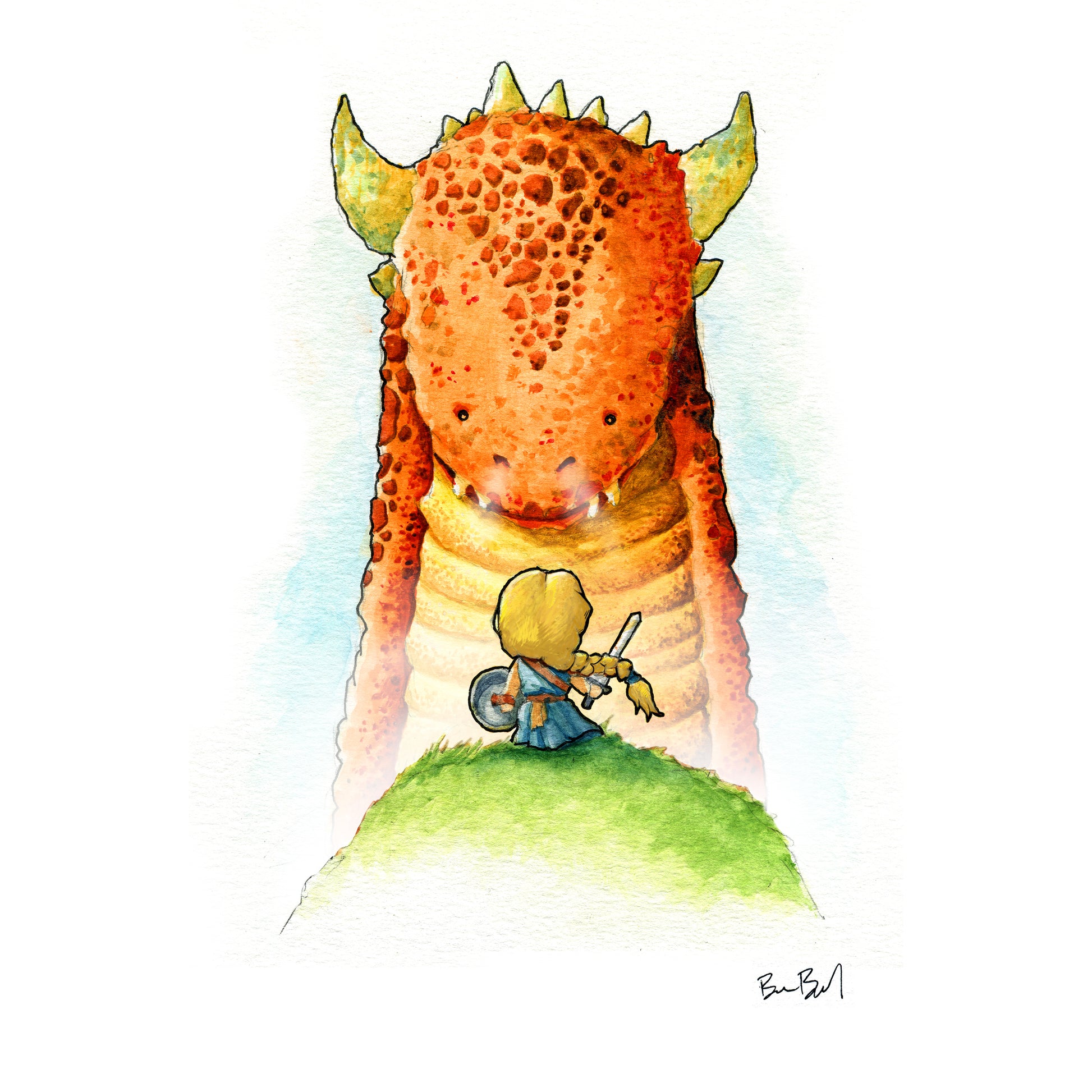 A brave little girl confronts a fierce dragon. Her only weapons are her courage, a sword, and shield. It will be enough for this warrior!